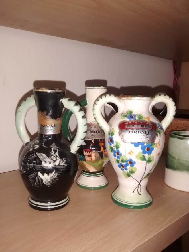There’s an old wooden clock ticking away on the shelf above. I found that in Dad’s attic. It used to be in my bedroom when I was a little boy. And on the shelf beneath there are three miniature urns, not much bigger than eggcups, which once contained Creme de Menthe.