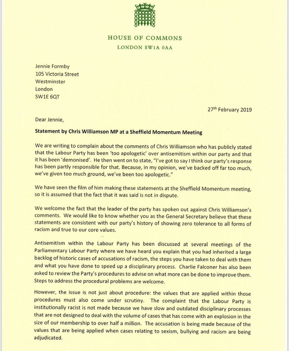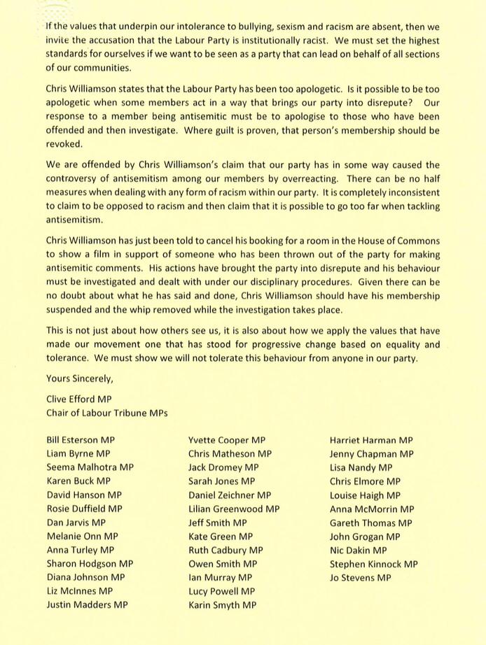 A strongly worded letter written by Clive Efford MP, chair of a group known as the Labour Tribune, called for Williamson’s suspension after he had offered an opinion that Labour had been “too apologetic” against allegations of anti-Semitism when the party had always been strongly anti-racist.