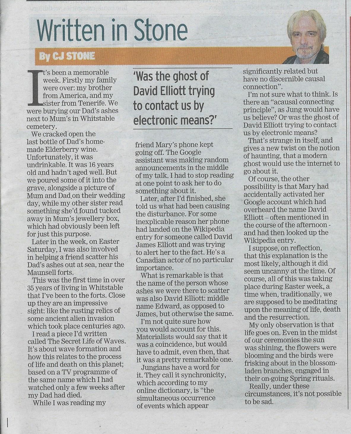 I’m not sure what to think. Is there an “acausal connecting principle”, as Jung would have us believe? Or was the ghost of David Elliott trying to contact us by electronic means?