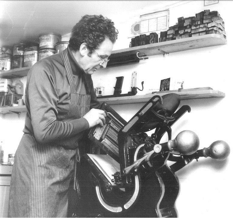 Acquiring a letterpress in the 1950s he mastered the skills of typesetting.