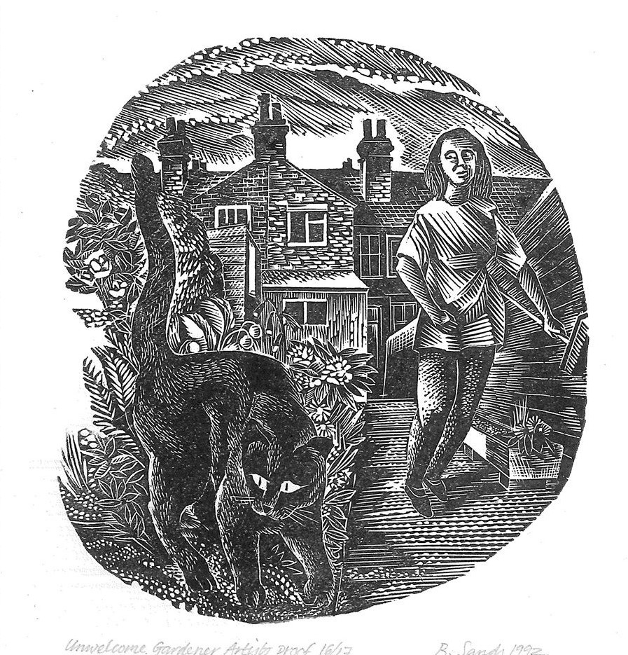 Unwelcome Gardener: a small woodcut composition which pictures Bonna watching the family pet Pushkin disturb the flowerbeds in the back garden.