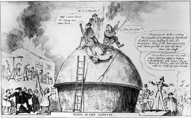According to E. P. Thompson (1963), the wholesale enclosure of common land between 1760 and 1820 and the loss of the rights to cultivate it led to the impoverishment of the landless labourer, especially in the south of England, who was left to ‘support the tenant-farmer, the landowner, and the tithes of the Church’. (1) However, poor harvests, low wages and high unemployment between 1829 and 1830, led to hunger among poor agricultural workers and their families. To add to their troubles, the Agricultural Revolution had introduced new technology such as the threshing machine, which separated the grain from the stalks by beating it, and thus dispensed with the need of workers to perform this task. This situation resulted in protests that started in Kent and later spread to surrounding counties and further.