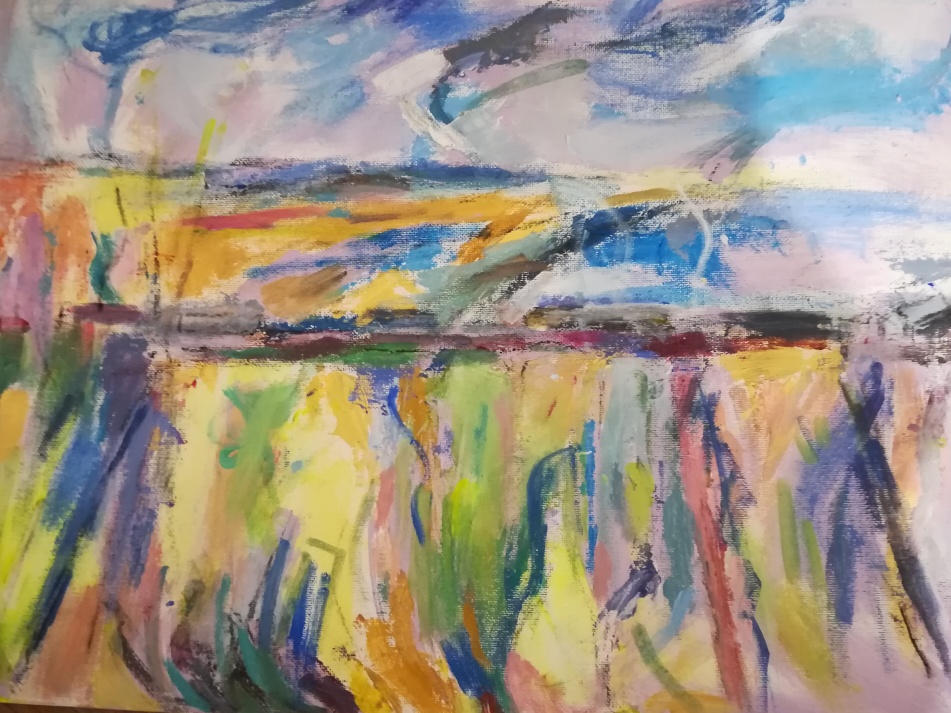 Primarily I am a landscape painter. I am interested in colour and mark making as a means of expressing emotion. The artist John Constable said “Painting is but another word for feeling” and I believe this relates to my work. I also write stories and poems. The two art forms are linked for me and I have sometimes used text when exhibiting my work.