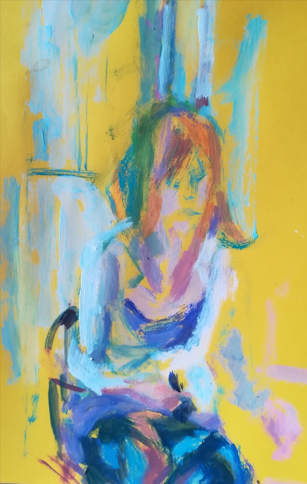 In Self Portrait-ill painted at the end of May I tried to objectively represent myself as a woman diminished by illness but there is an energy which contradicts this in the contrasting use of yellow and violet and the gestural marks which describe the form.