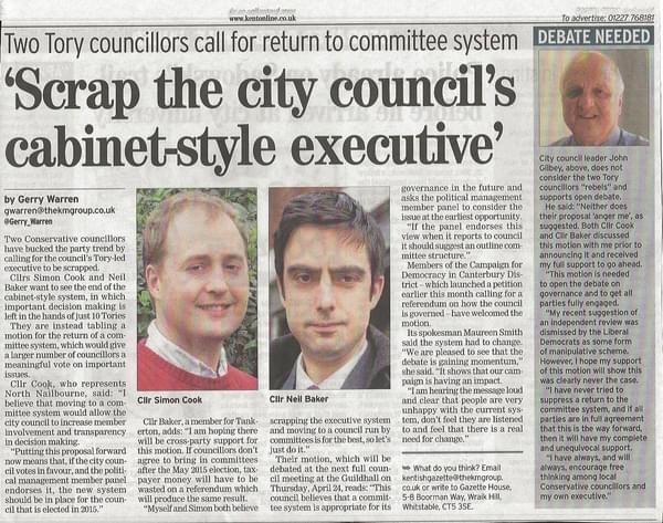 For those with a short memory: Canterbury did have a leader and cabinet system once. This system was forced on councils by the then Labour government in 2000 and operated under a local Liberal Democrat/Labour coalition until 2005. After that it was continued by the Conservatives under the leadership of Cllr John Gilbey.