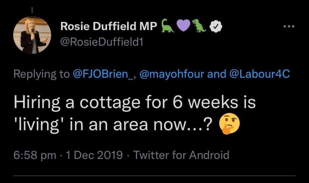 In spite of all this, and in what appears to be an incredible act of hubris Rosie Duffield has indicated that she again wants to be the Labour parliamentary candidate for Canterbury & Whitstable at the next election. Presumably, considering her apparent move to North Wales, Ms Duffield has forgotten that she posted the following comment about a previous parliamentary candidate’s tenuous link to the constituency:-
