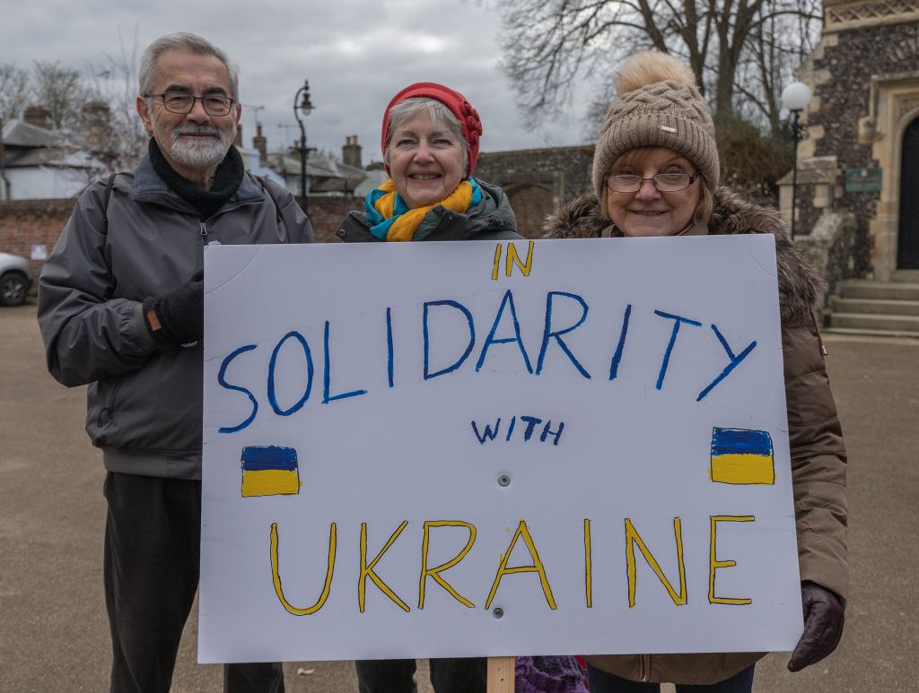 What does solidarity look like? It looks like this march and protest. It looks like demanding our governments welcome ALL refugees. It looks like the Kent and Cheshire dockworkers who have refused to unload Russian oil. As we did against the Iraq war, they are saying “not in my name”.