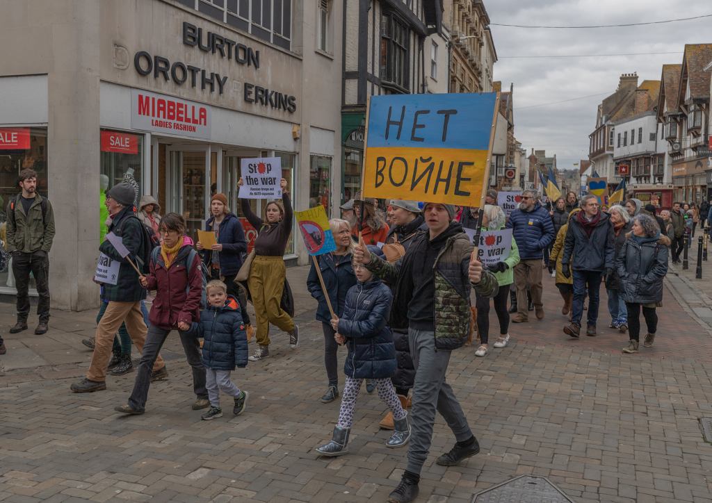 On Sunday 6th March 2022 a Stop the War protest was held in Canterbury, in conjunction with Stop the War rallies and marches taking place throughout the United Kingdom. Around 150 people attended on what was an unseasonably cold day. They marched from the assembly point in Westgate Gardens, along the High Street, to Dane John Gardens, where there was music from Elephant’s Eye and speeches and read out statements by various interested parties.