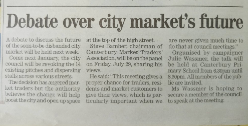 You are invited to an important Public Meeting taking place in Canterbury this Friday 29th July to discuss and expose matters surrounding Canterbury City Council’s plans to disband Canterbury’s historic market in favour of spending £1.2m “improving” St George’s Street – and scattering traders to sites across the city.