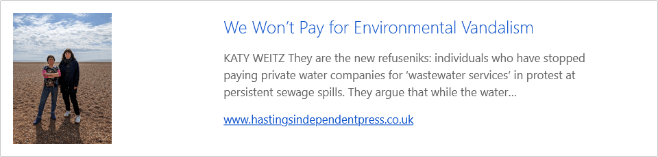 I would very much like to thank all the Hastings boycotters, with whom I am remaining in close contact – and all those from other areas in the UK who have contacted me to let me know they have taken similar action to end the abhorrent practice of sewage dumping in our seas and rivers.