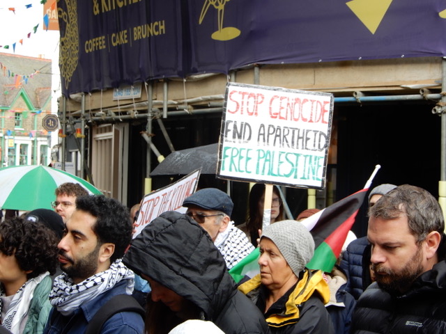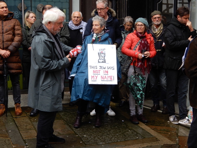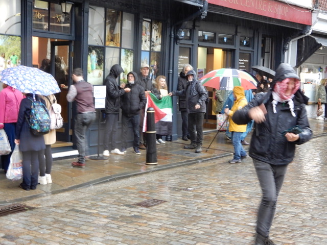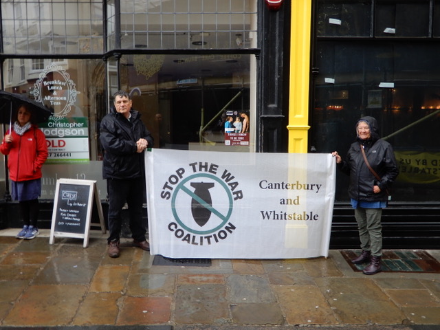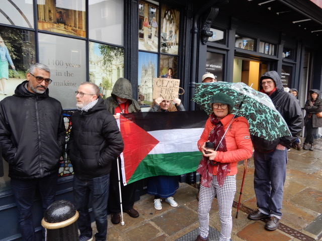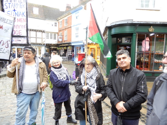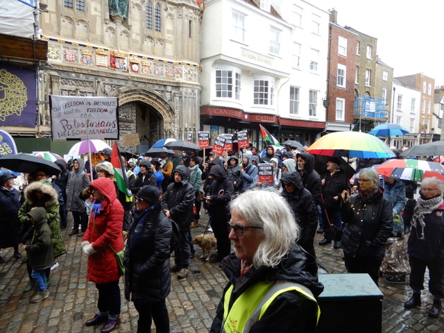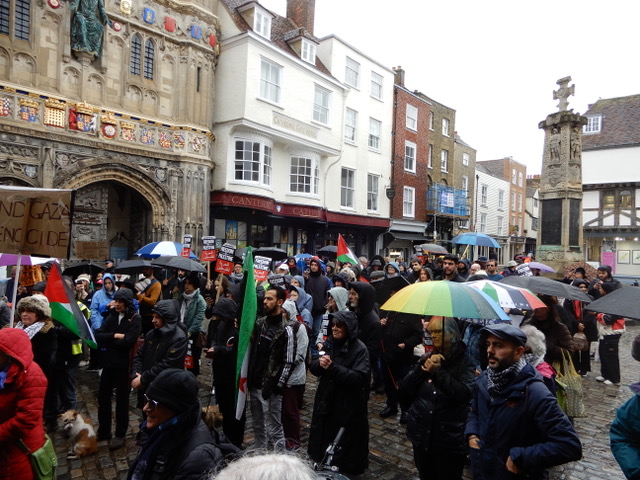 I attended the rally for Palestine outside the Cathedral gates in the Buttermarket in Canterbury on the 29 October 2023. It was good to see so many of my friends there. It was pouring with rain when I first arrived, but as the day wore on, the sun came out. I would guess that there were about 200-250 people. They were there to show solidarity with the people of Gaza as they are being subjected to the vicious and unending onslaught by the Israeli armed forces. I refuse to call them the “Israeli Defence Force” as they are so obviously not involved in any defensive manoeuvrers as they bear down upon a trapped population in what can only be described as a concentration camp: killing men, women and children indiscriminately, attacking hospitals, churches and mosques, destroying civilian infrastructure, cutting off food, fuel, medicine and water, while pretending to go after Hamas.