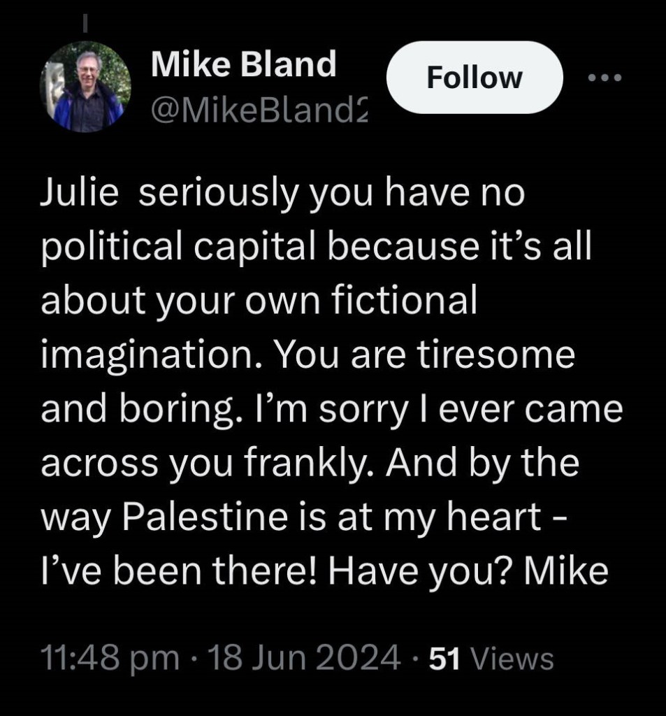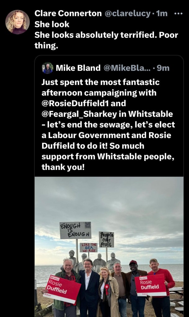 For the record, for Rosie Duffield, her social media followers and Times Radio, on the day of the Canterbury protest against Rosie Duffield’s campaign launch I was at home, in Whitstable, with my husband who was recovering from recent cancer treatment – and I make this clear because the combination of Duffield’s comments to her X followers via QTs, and to Andrew Neil in her Times Radio interview, offer an entirely false and misleading impression, one that I’ve been advised may harm not only my own safety but my professional reputation as a TV writer, author and journalist. Duffield refers to me on her X feed as “utterly fixated” and “obsessive”; accusations that she regurgitates in the echo chamber of her social media account – and I understand not for the first time either.