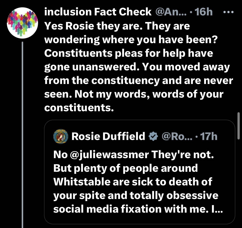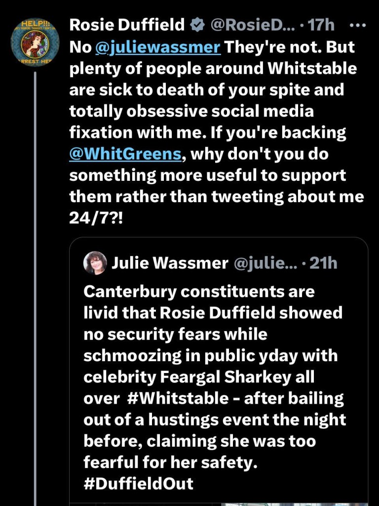My tweet concerned the anger of local residents in my home town of Whitstable, who had learned that, having bailed out of a hustings event claiming fears for her “security and wellbeing”, Duffield was back in town less than 24 hours later, posing for photographs on our beach, and in the local pub, in a planned photo opportunity for her election campaign.