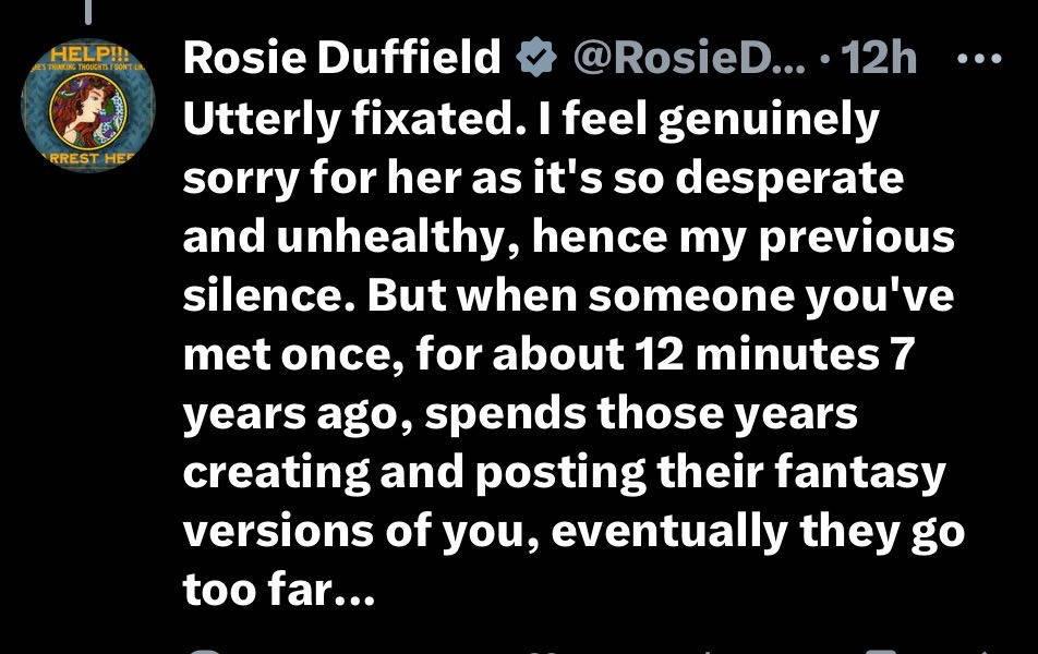 Duffield appears to be conducting an imaginary conversation with me, to which she knew I could never contribute – or take issue with – or respond to her abuse, ironically all while she assumes the role of victim. I was therefore advised to take action and block Duffield’s X account myself or expect that she would continue to use access to my page which she has clearly had for several years.