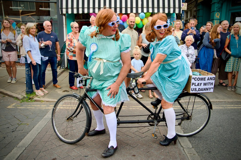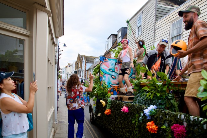 Memorable moments include the Farskate Foundation’s float, with a giant working puppet of a skateboarder doing flips and tricks. The Farskate lot also did the wonderful mural that was displayed outside the Coach and Horses near the Library Square. There was the Sound Crumpet sound system, put on by C.A.L.M., the Campaign Against Living Miserably. The music was Drum’n’Bass and Jungle but there was a pensioner in a cowboy hat sitting on a disabled scooter jiggling about to it, getting into the rhythm with all the young folk. Sam the Giant was there, and the inimitable Sadie Hennessy, with friend Dicky Stringer, on a tandem, being the creepy twins from The Shining. There was the Fish Heads from Total Pap: Justin and Emily’s first official outing since they got married a few weeks ago. And little Mila on the Surrey Carriage, Whitstable’s own very special Icon.