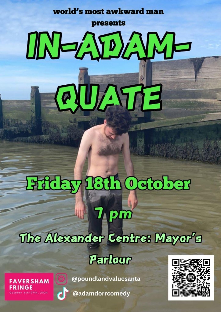 Adam Dorr is a Canterbury based rising star! You’ll adore Adam Dorr. His comedy just keeps getting better, unlike his autism, but you’ll join him in seeing the funny side of life from a unique perspective if you go see his show In-Adam-Quate on Friday 18th October at 7 pm in the Mayor’s Parlour. His autobiographical exploration of all facets of life from the perspective of the world’s most awkward man should be a charming delight: just like him! https://favershamfringe.co.uk/2410-2