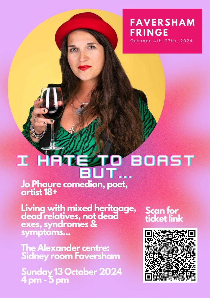 On 13th October at 4 pm in the Alexander Centre, Whitstable based comedian Jo Phaure will bring her first full length show to the Faversham Fringe. ‘I hate to boast but…‘ features her usual acerbic wit and dark anecdotes. Ably hosted and with a whip smart set from fellow St Mary’s alumni, Genevieve Pepper, and featuring the successful musical comedian, Neil Long, this show will be a fast paced, X-rated round up of neurosis, failings & exes. Followed by a conga to Faversham Spoons! https://www.ticketsource.co.uk/whats-on/faversham/the-alexander-centre-sidney-room/i-hate-to-boast-but-jo-phaure-comedian-poet-artist