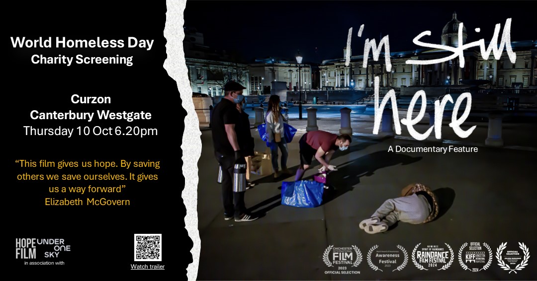 The I’M STILL HERE team are working with 8 cinemas across the UK to show the film on World Homeless Day (10 Oct). Curzon is giving the film full support by donating 3 screening locations. The film screens at Curzon Canterbury Westgate on Thursday 10 Oct at 6.20pm: https://www.curzon.com/films/im-still-here-homelessness-documentary/HO00005776/