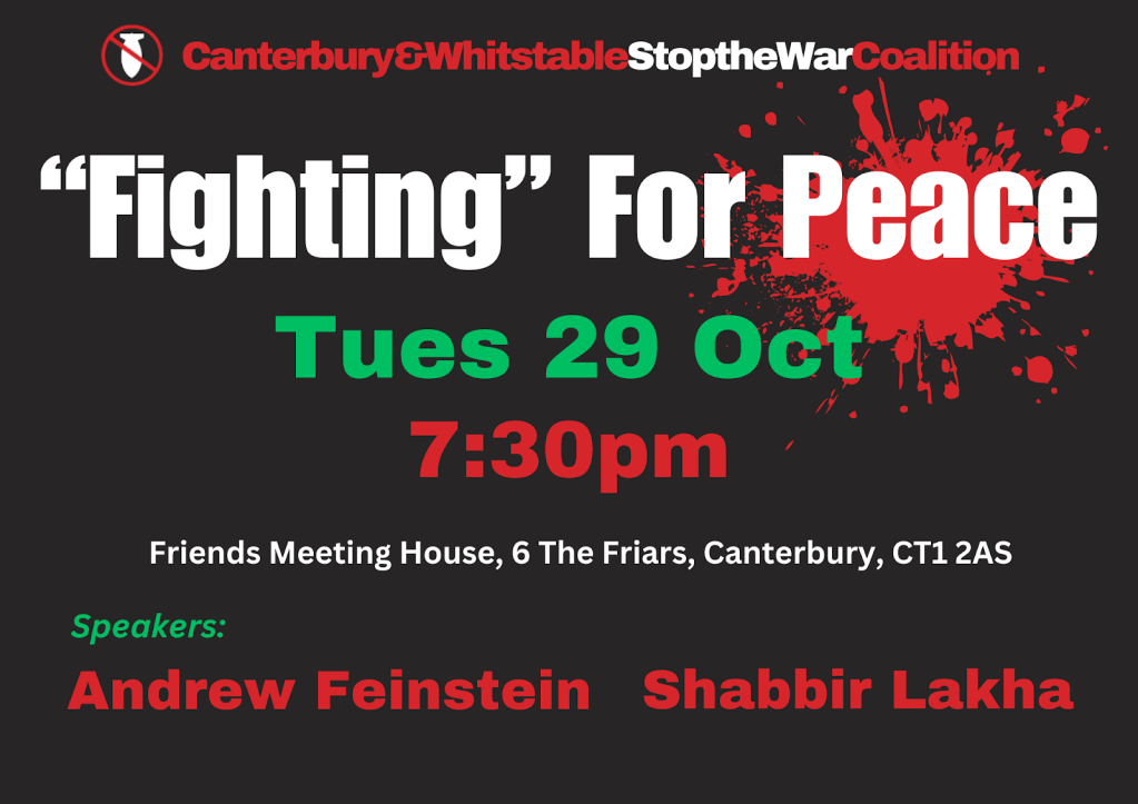 Hybrid meeting: Tuesday 29th October at 7.30pm at Friend’s Meeting House, 6 The Friar’s, Canterbury, CT1 2AS. The title is ‘Fighting for Peace’. To get Zoom link, and for all other information, please contact us on: