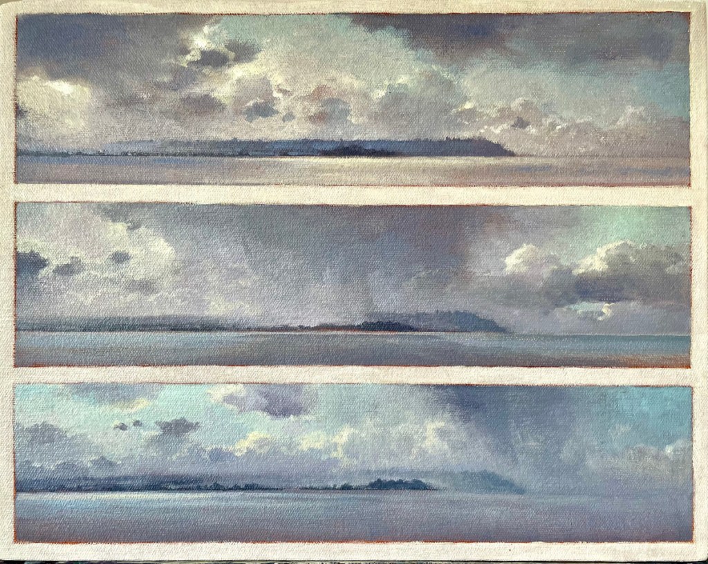 I can now work directly on canvas while engaging with my subject and depict various sea states and light events that may have otherwise evaded me. It has become possible to study storms in greater detail and track showers and their influence on the sea in some degree of comfort. These paintings are therefore composed in my imagination based on observed realities. They are true to my inner eye.