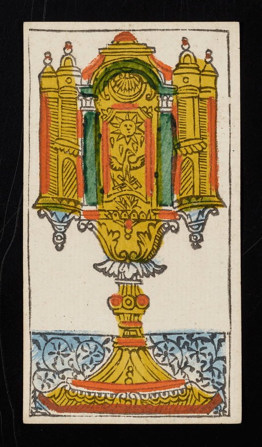 I was in a state of excitement as all of this was going through my head. I rushed upstairs to where the party was still going on to tell everyone what was happening. As I stepped into the room my eyes fell on a number of objects. There was Arthur’s sword, leaning up against a wall, alongside his staff. There were a few other staffs in the room too. These were Druids, remember. Then I looked down and on a small table in front of me there was an elaborate, medieval-looking silver goblet with a stem, not unlike the one represented as the Ace of Cups in the Tarot (see above). It was sitting on a circular silver tray. So there they were, the Four Hallows of the Holy Grail, right before my eyes, a sword, a stave, a cup and a disk, confirming what had been going through my head only moments before. All of this must have come pouring out of my mouth in a stream of excited blathering as I demanded that Arthur knight me there and then, which he duly did.