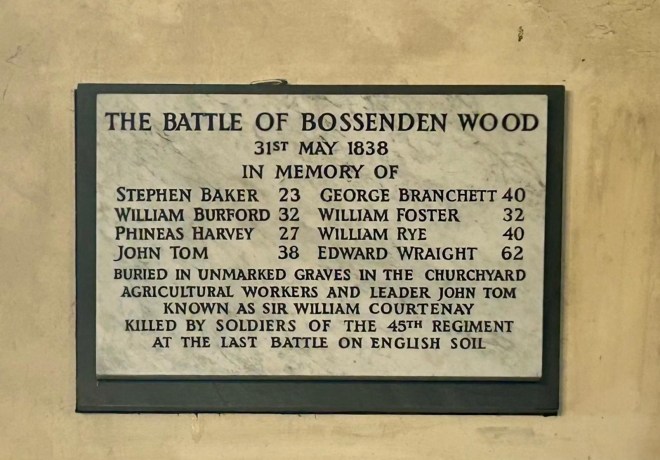 Until recently the battle remained almost unknown, perhaps because of the tendency to dismiss it as a `riot’ led by a madman. However, interest in it and understanding of its importance have been growing recently. Last year, three men from Dunkirk placed a stone marker at the site of battle and succeeded in getting it included on Ordinance Survey maps. Quite separately, a small group – the Battle of Bossenden Wood Memorial Group – started a campaign to publicise the battle and to foster understanding of its significance.